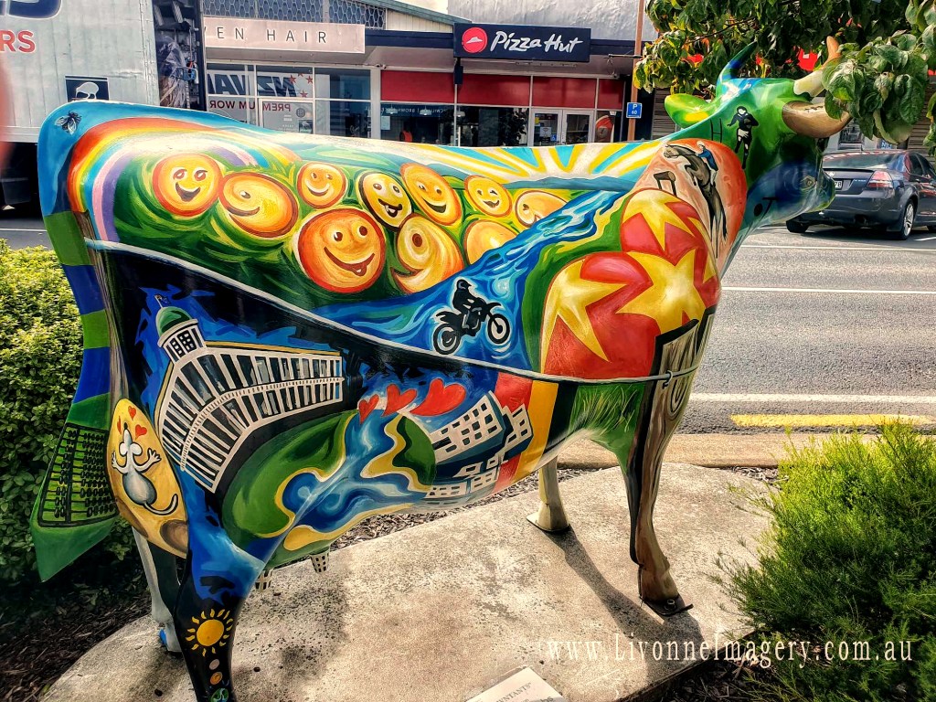 Anyway, after lunch we left the Hamilton Gardens and meandered home, detouring along the way to a town called Morrinsville. Morrinsville is one of New Zealand’s most prosperous dairy farming areas. So it stands to reason there is a large population of real life cows that go moo but what you might not expect to find is a group of 60 brightly coloured, artist designed, fibreglass cows which are scattered around the town.