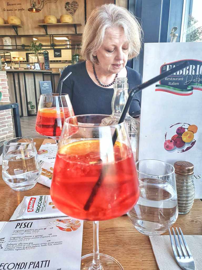 As the afternoon progressed to evening, at fear of going to sleep, we got moving to have some dinner. The Italian restaurant, La Fabbrica Del Gusto, which was closed earlier looked good, and Cecile had taken a photo of their menu which we ran a translate app over. Yes, we understood that we should probably be eating French food in France rather than Italian, but it’s what we felt like. Besides the Italian we had in Windermere Uk was the best food we had in the UK. We woke ourselves up a bit and though we were both a bit dubious about whether we would be understood or not, we headed there for dinner. Walking in the open door, we asked for a table for two and the chef said they weren’t open yet.. Ooops.. Anyway, a server came across who had some English and said it was okay, and found us a table.