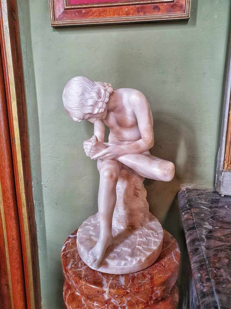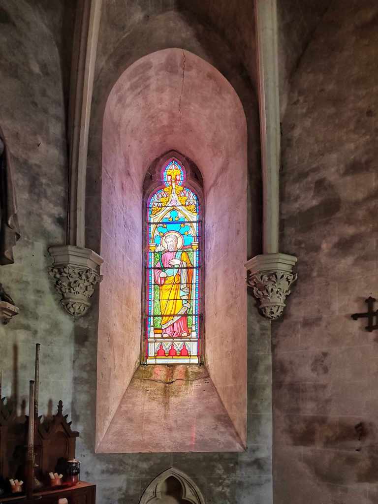 You will all get sick of my photos from this place and honestly? I don’t care. I can’t get enough of it. Everytime we drive down the driveway to get back here, I can’t wipe the smile off my face. It is magnificent. But anyway, I took heaps of photos from the turret and then we headed over to have a look at the chapel. What a little piece of serenity. The stained glass windows and beautiful old religious statues all felt so homely and peaceful. There was a model ship hanging from the roof which while beautiful, seemed out of sorts with the reverence of the chapel. Then we tried to work out what a screen attached to the wall was and we think it was a confessional with no privacy but I suppose with your own chapel, you don’t need to worry about being disturbed while you share your secrets with your priest.