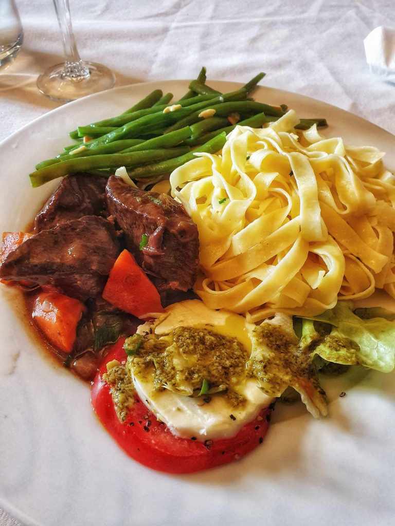 So anyway, back to food as it always is here. Tonight’s meal was beef bourguignon with egg noodles, caprese salad and beans almondine as well as mushrooms. Every night we say it was the best meal we’ve had so far and we genuinely mean it. There hasn’t been a meal we haven’t liked. For dessert tonight, we had a dish with homemade lemon curd, cream and fruit. It was divine.