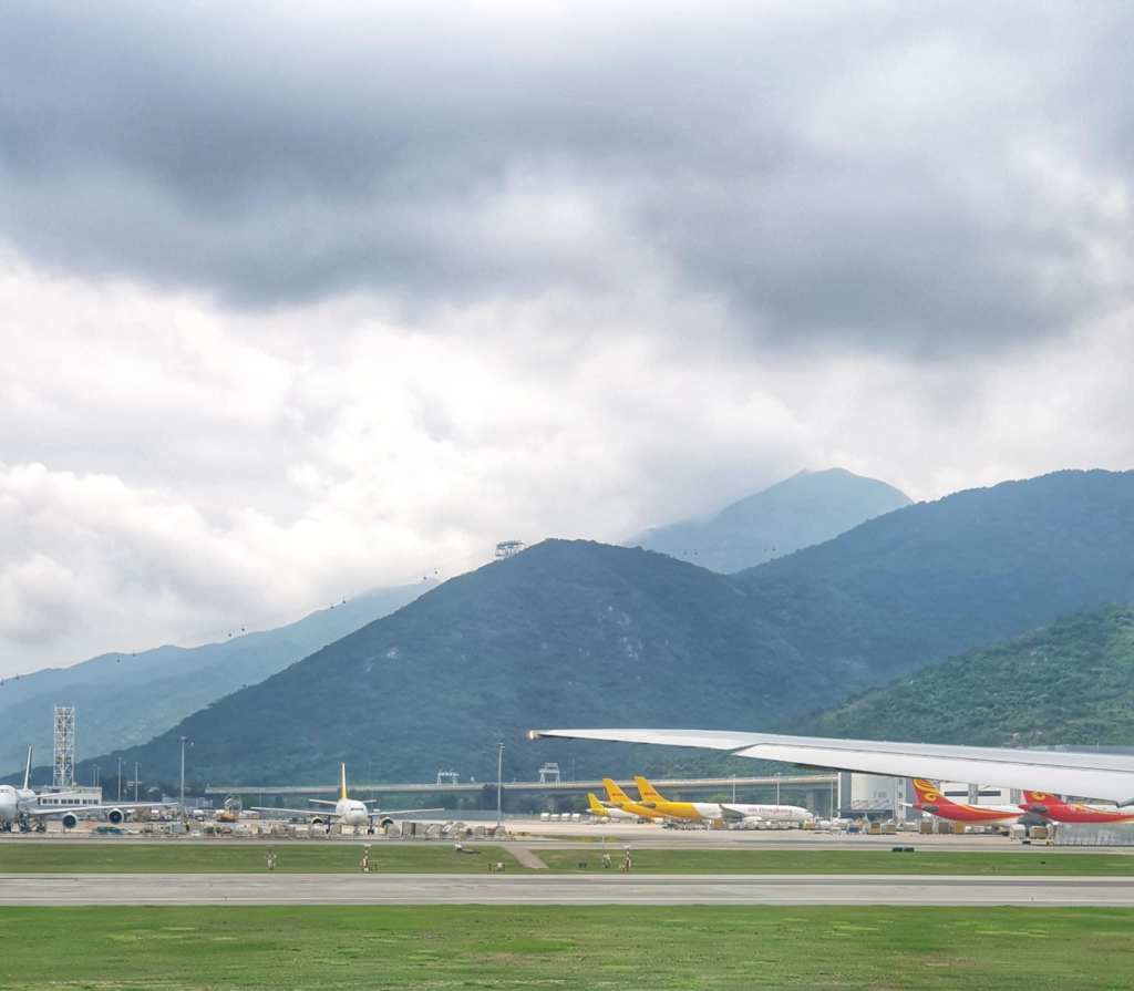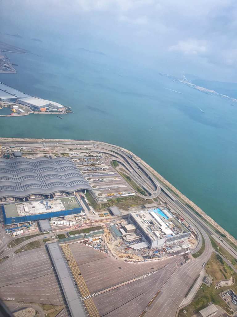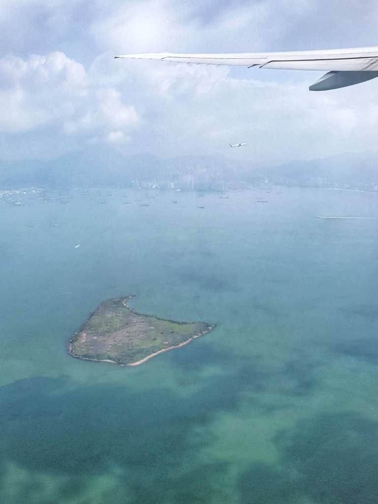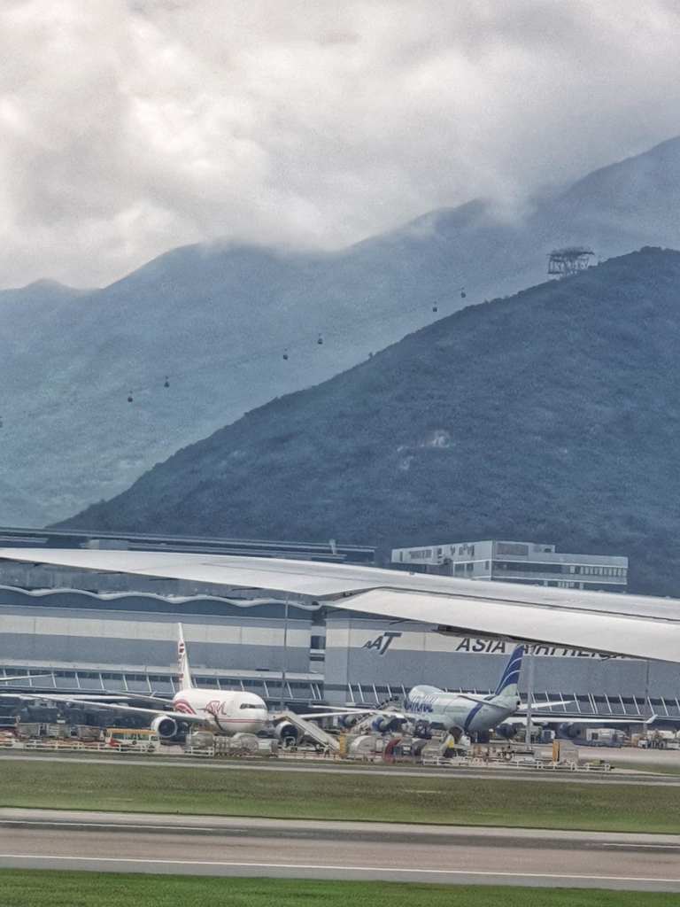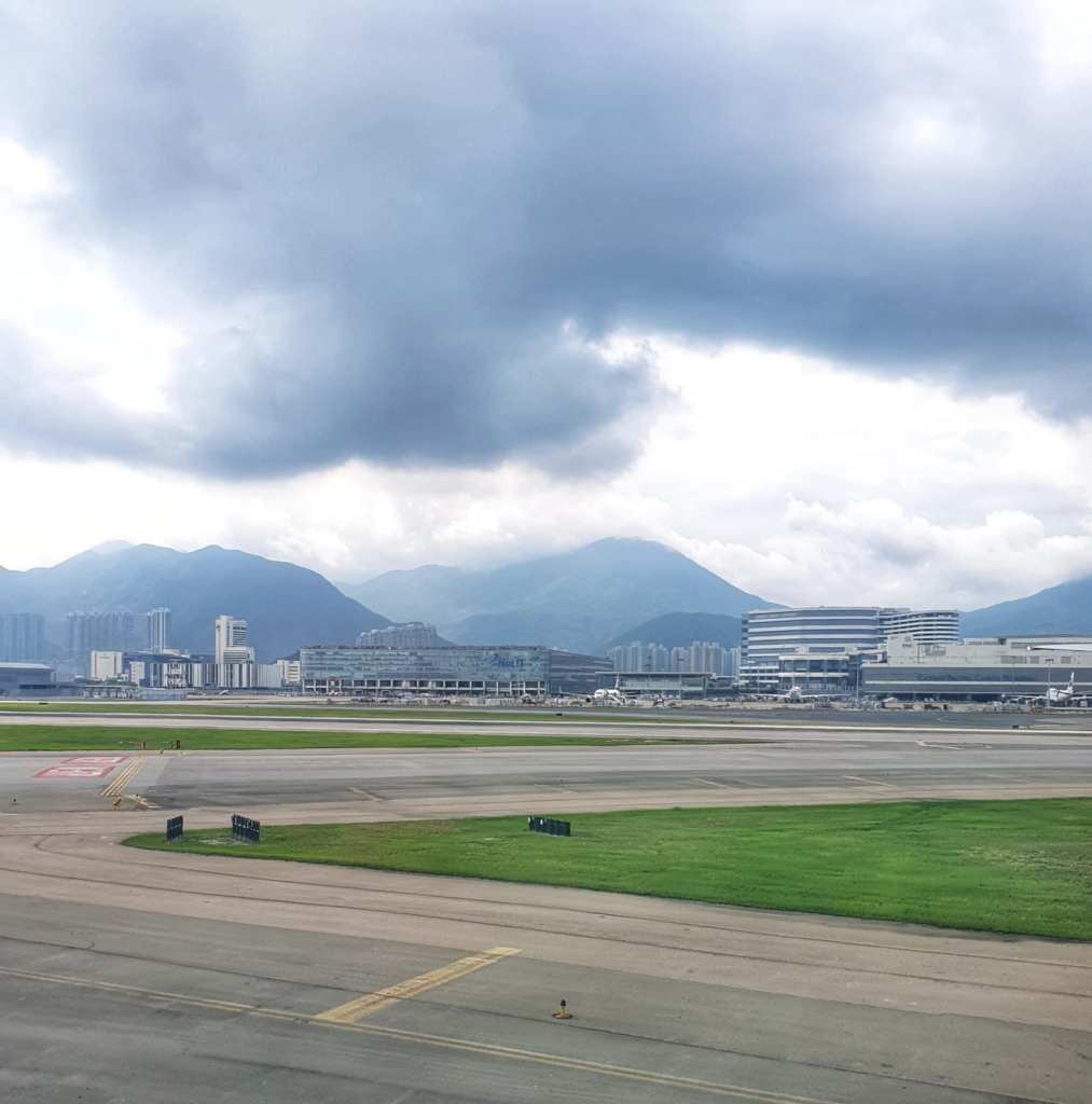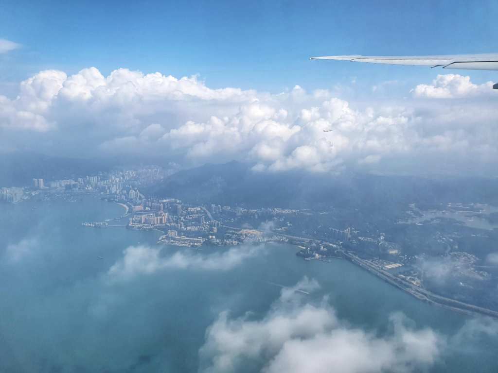 We settled at our gate and I posted the last of the Paris blogs (other than this final one which wasn’t really in Paris) then caught up with some social media and just relaxed till it was time to board. I was thrilled to see that we were sitting in a 3 seat row with only our two bums on them, so we had another seat between us. Bonus. As we were taxiing, there was a great view of the mountains and though they were covered in clouds, you could see the cable cars. Then when we took off we got some great views of Hong Kong, even with other planes taking off around the same time. This was it.. The final leg of our adventure.